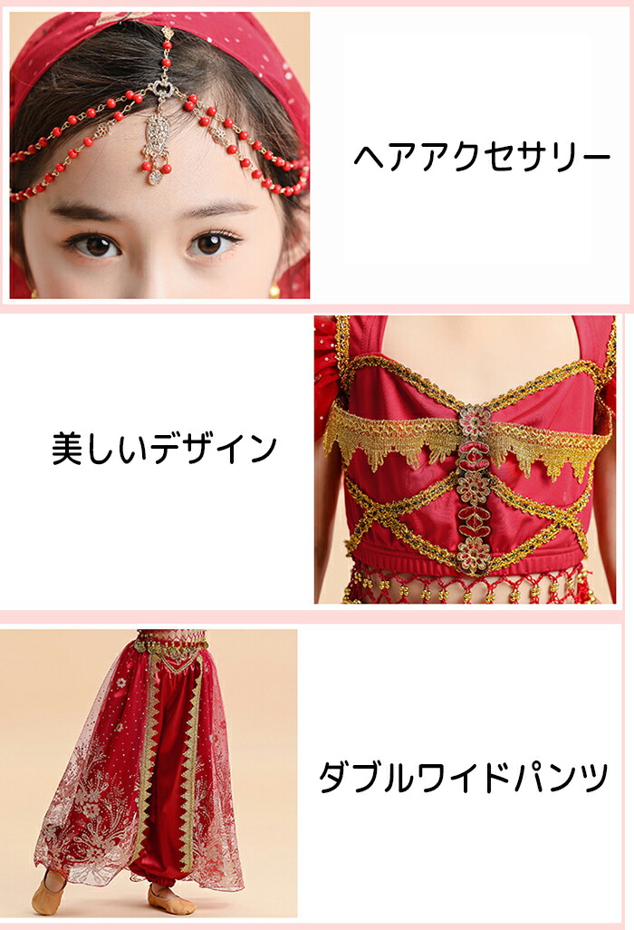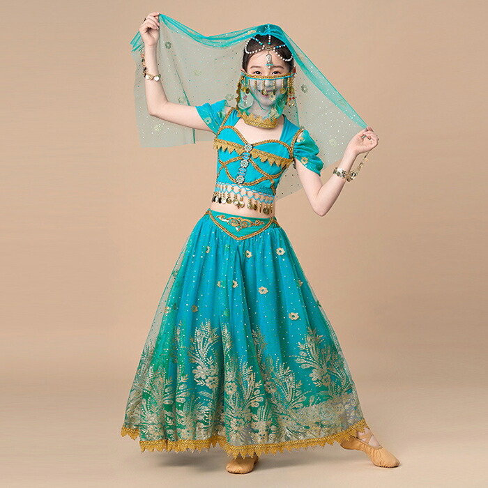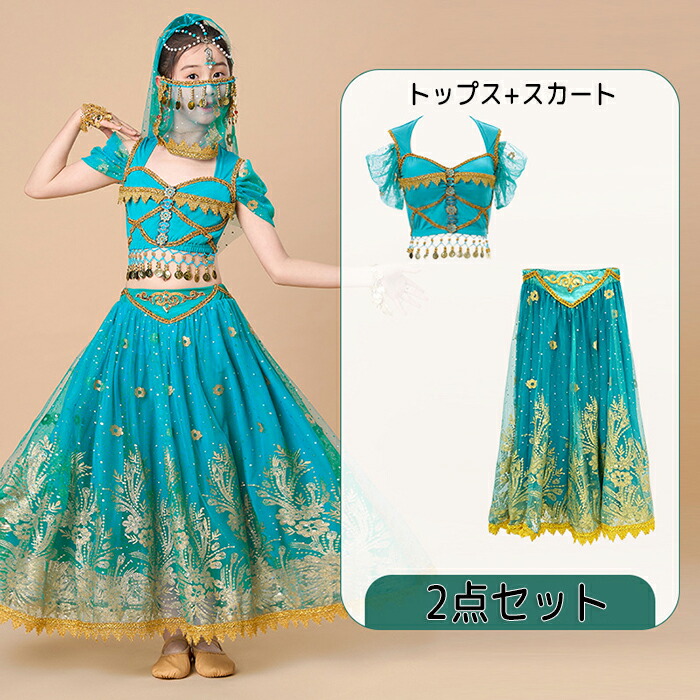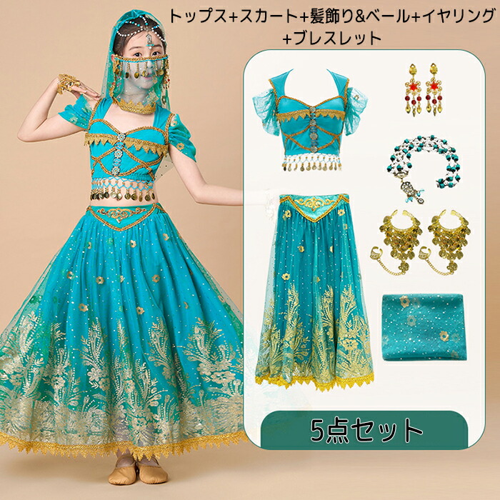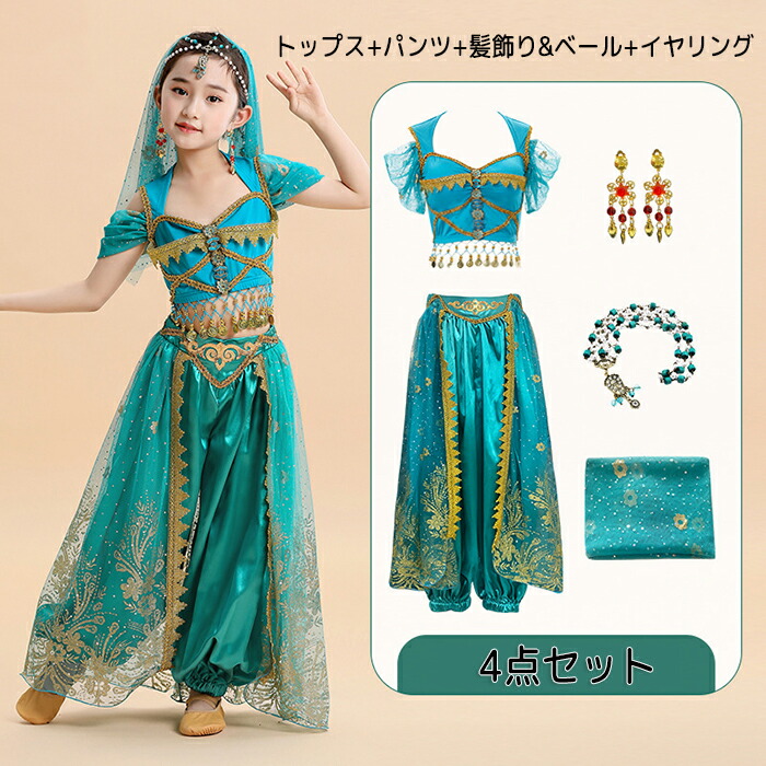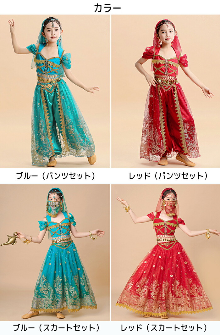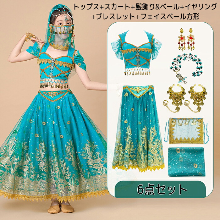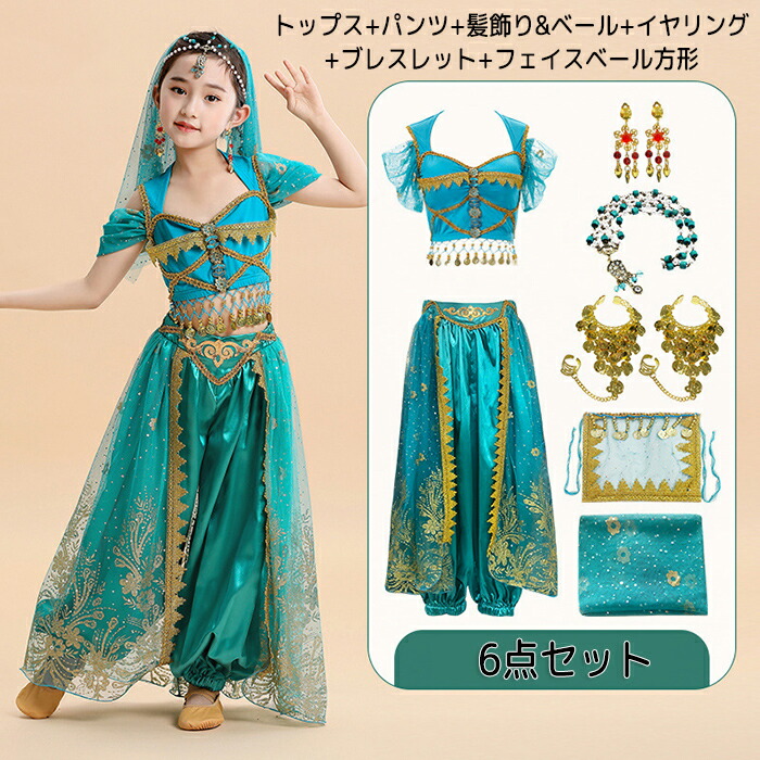 ハロウィン衣装 キッズ 仮装 こども プリンセス お姫様 ジャスミン 6点セット パンツセット スカートセット なりきり ベリーダンス レッスン着 半袖 アラビアン 女の子 コスチューム アラビ 衣装