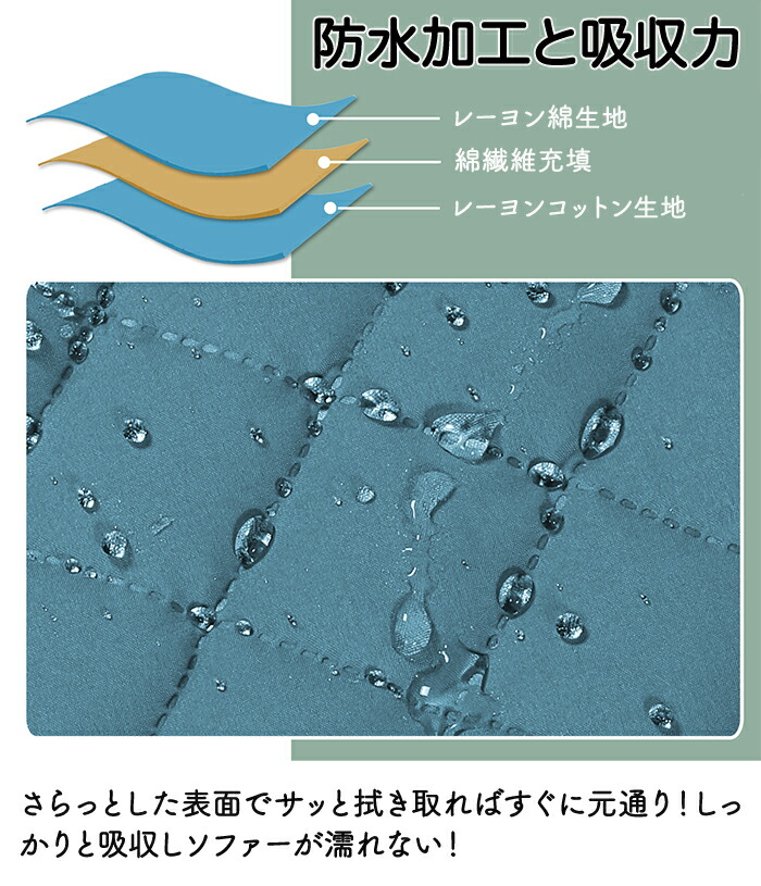 防水加工で濡れてもサッと拭き取れば元通り!水を吸収するのでソファーが濡れる心配もありません。