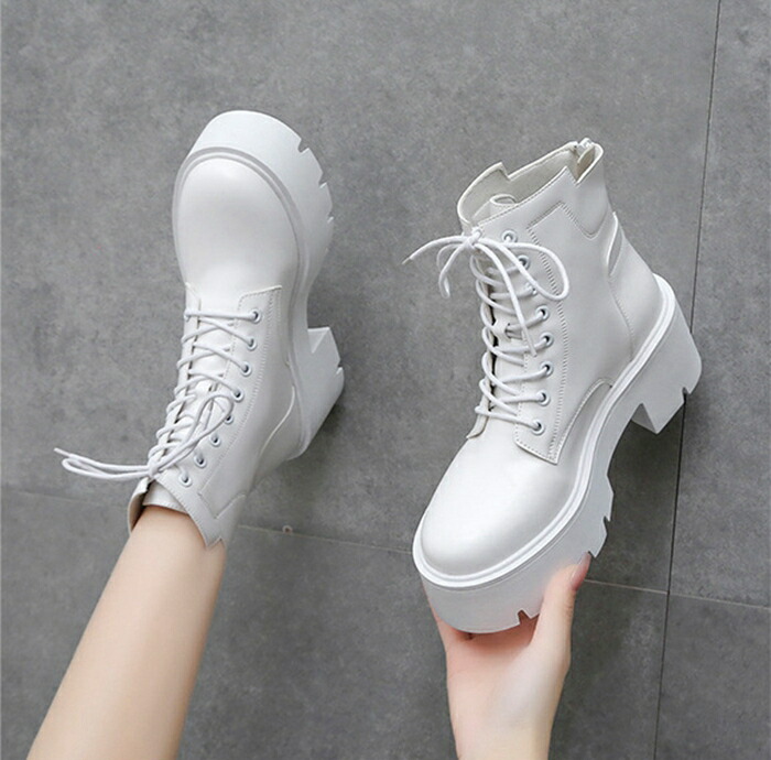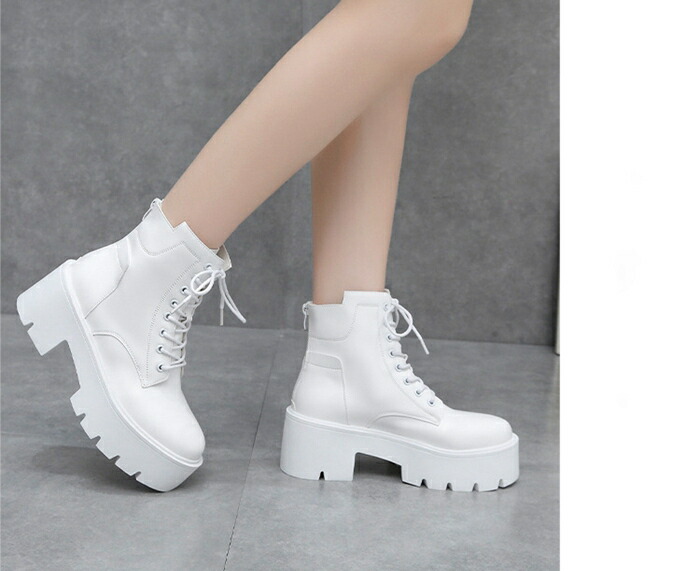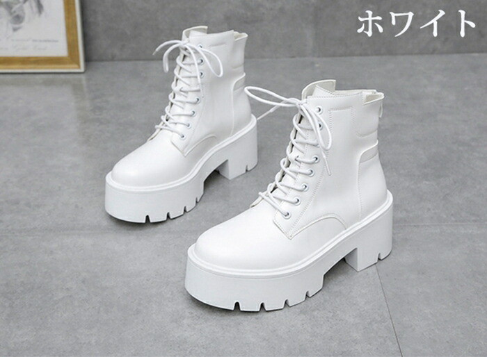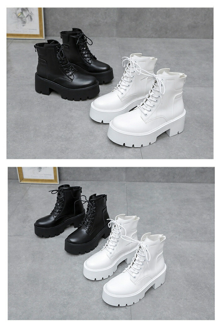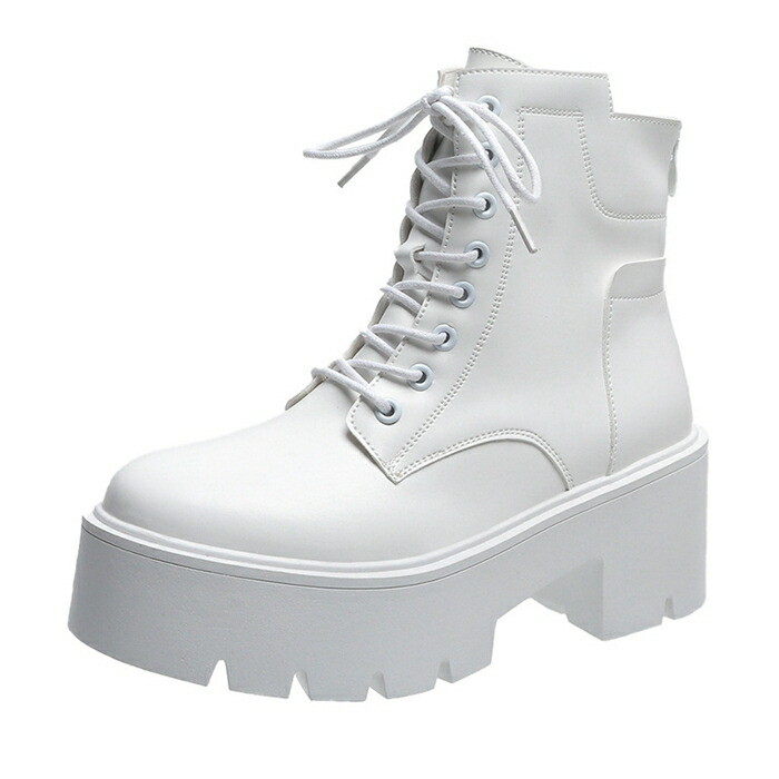 商品名:ショートブーツ レースアップブーツ レディース ラウンドトゥ 厚底 7cmヒール ハイヒール 編み上げ 靴 スタイルアップ ショートブーツ 美脚 黒 白 靴 痛くない 履きやすい 英国風ブーツ PU 無地 太ヒール 軽量 シンプル 通勤 通学 デート 春 秋