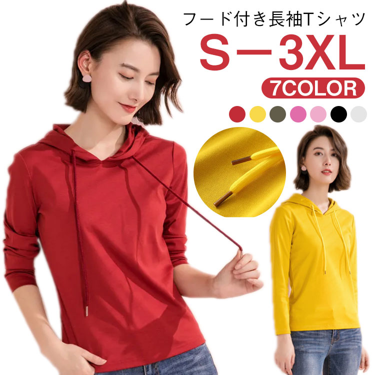 フード付き Tシャツ 長袖 パーカー レディースファッション 通販 ホワイト ブラック レッド イエロー カーキ パープル ピンク S M L XL 2XL 3XL