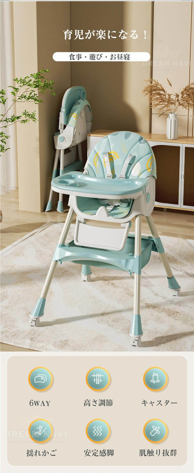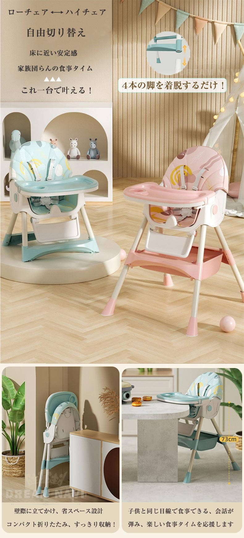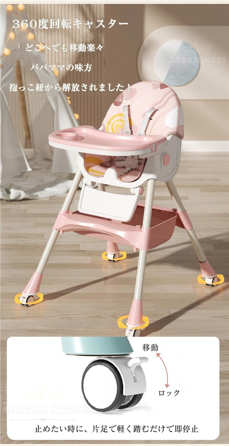 多機能 折りたたみ ベビーチェア ハイチェア ローチェア ハイローチェア 3WAY 切り替え テーブルチェア リクライニング ロッキング キャスター 椅子 安定構造 立ち上がり防止 離乳食 滑り止め