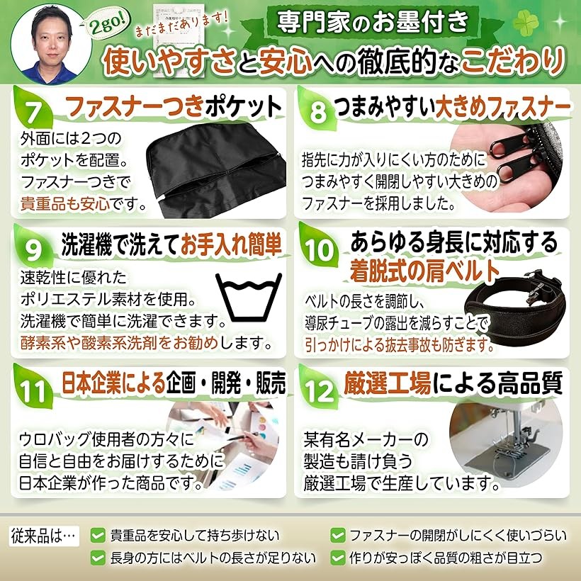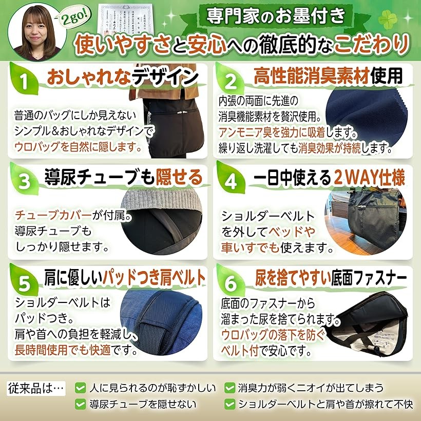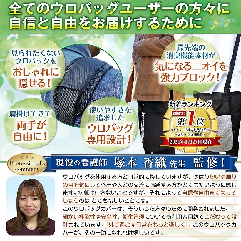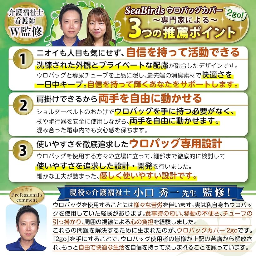「現役の看護師・介護福祉士によるW監修」 「ウロバッグユーザーの方々に自信と自由をお届けして、たくさんの人に笑顔になってほしい」 そんな想いから生まれたウロバッグカバーです。