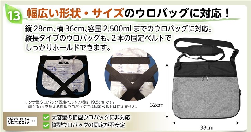 「使いやすさと安心にこだわったウロバッグ専用設計」 (1)タテ28cm、ヨコ36cm、容量2,500mlまでのウロバッグに対応可能。