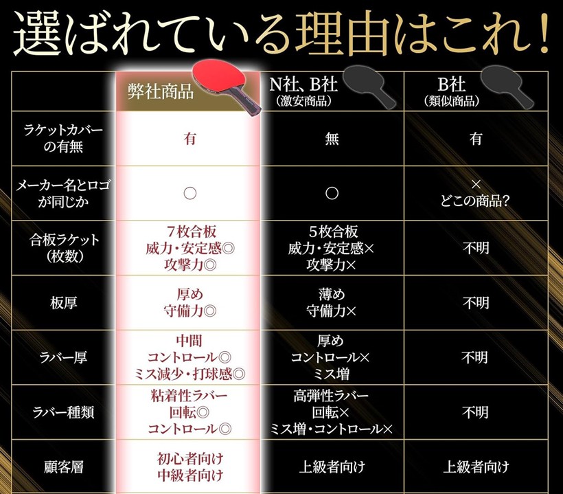 「隙の無い完成度」板、ラバー等で短所を長所で補完し合う、攻・守に隙の無い完成度の高いラケットです。