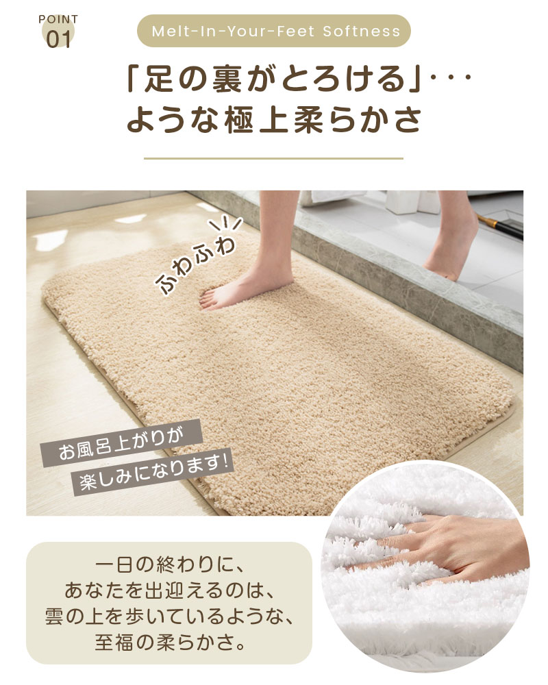お風呂上がりに足を乗せた瞬間、ふんわりとろけるような柔らかさで包み込むバスマットです。