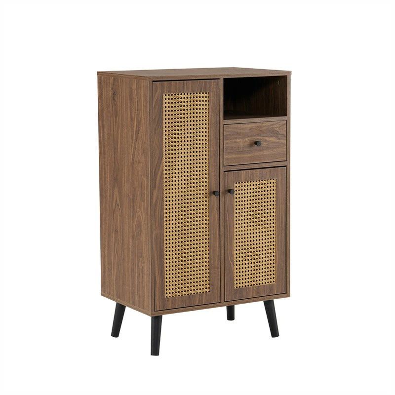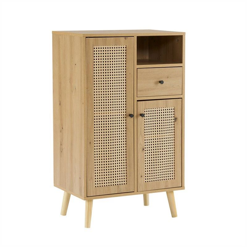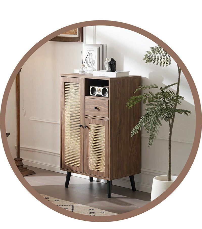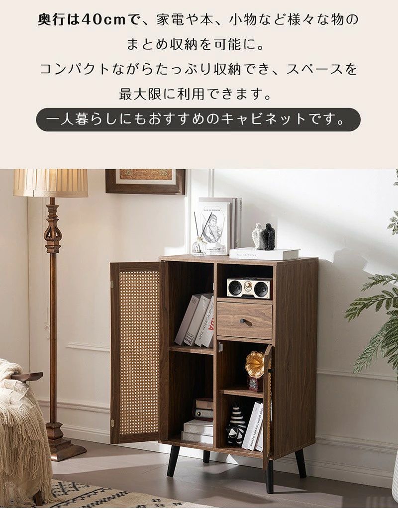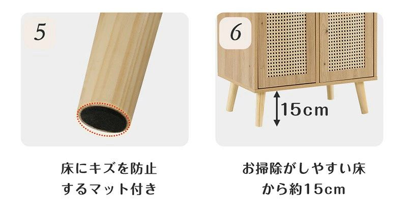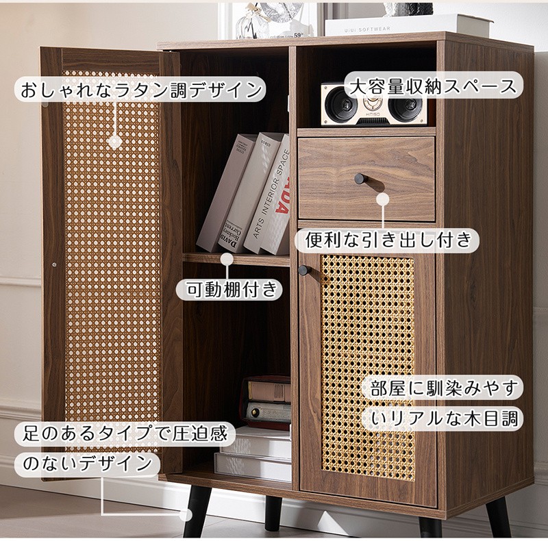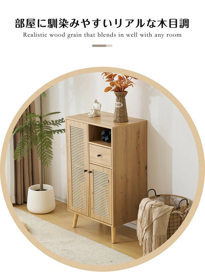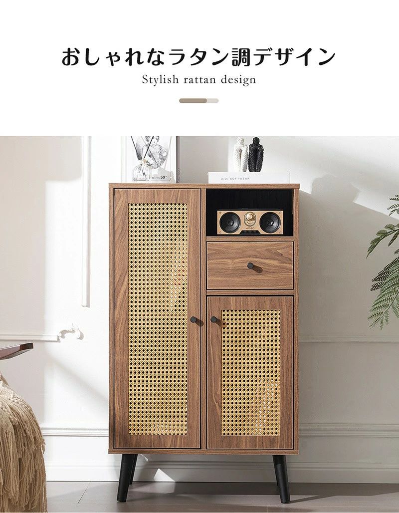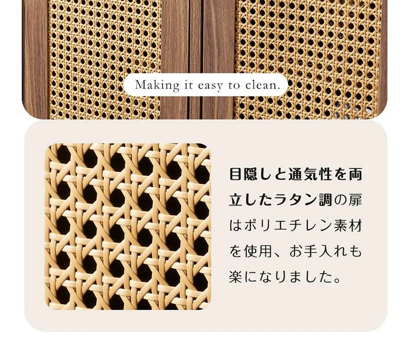 【おしゃれなラタン調デザイン】ラタンは繊細なかごめ編みを採用しており、圧迫感や重さが少ないのが特徴です。扉で隠し生活感のない洗練された雰囲気を演出、置くだけでセンスのあるお部屋に。目隠しと通気性を両立したラタン調の扉はポリエチレン素材を使用、お手入れも楽になりました。