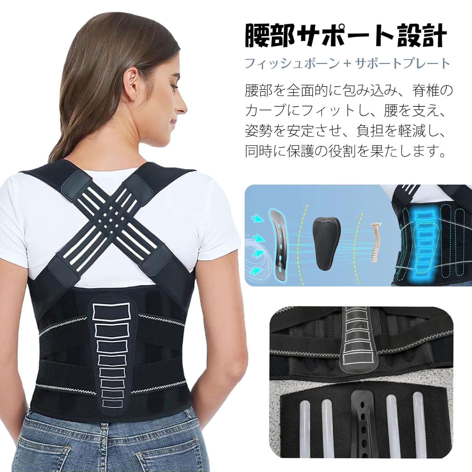 【背筋を強力にサポート】背筋ボーンで背中全体をサポート猫背ベルト背面部にABS製の「背筋ボーン」を内蔵します。装着すると、瞬時に背中が引っ張られるような心地よさが感じられます!そして、長時間着用しても安定したサポート力を提供し、無意識にいつも姿勢を保ち、簡単に崩れ落ちることはありません。これが 姿勢ベルト優れた補正力の「コアな秘密」です!ABS骨は背筋ステントの中間層に巧みに組み込まれている、刺さることもなく、目立たないデザインで装着時にも軽快で負担を感じません。