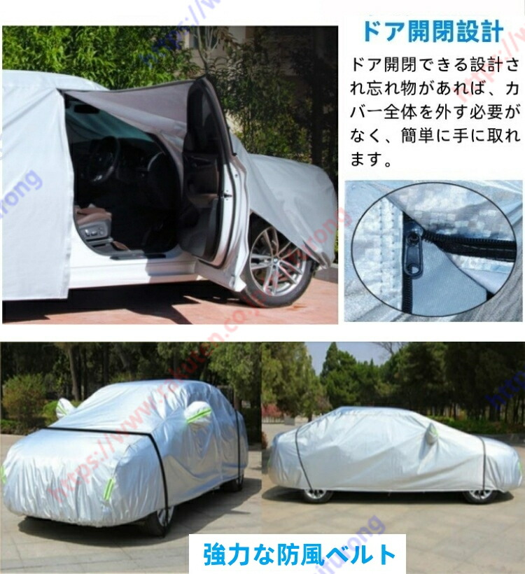 【強風対策】:強風や台風でカバーが飛ばないように設計を見直しました。カバーのフチにはゴムが施されており、車をしっかりとキャッチします。また、付属の防風ベルト2点セットを併用すれば更に安心です。