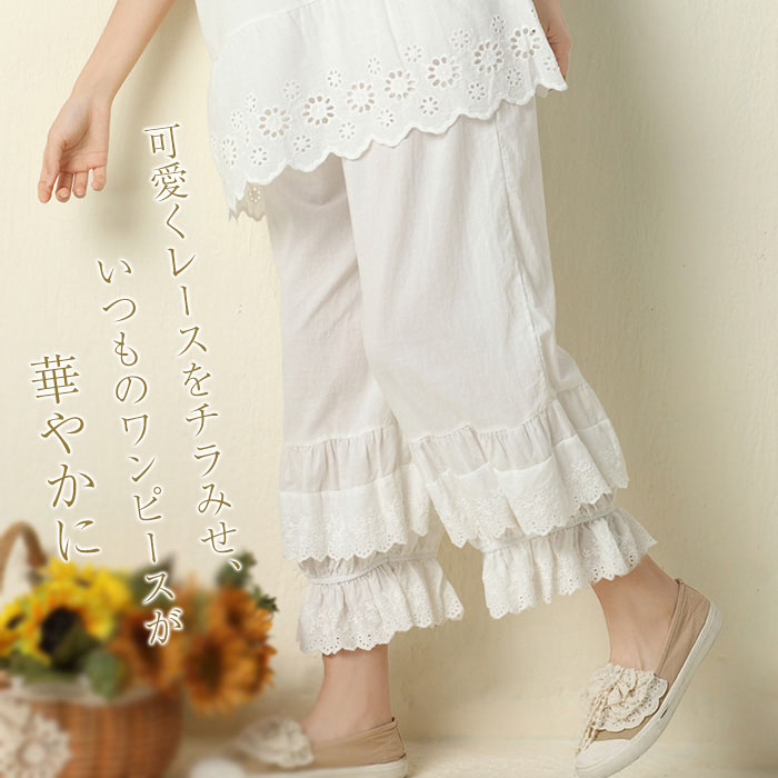 ペチパンツ レース 刺繍 ロング パンツ インナー 透け 防止 レディース ナチュラル 裾ゴム ゆったり 大きめ 楽 涼しい 春 夏 秋 かわいい おしゃれ シンプル カジュアル 重ね着 大人可愛い