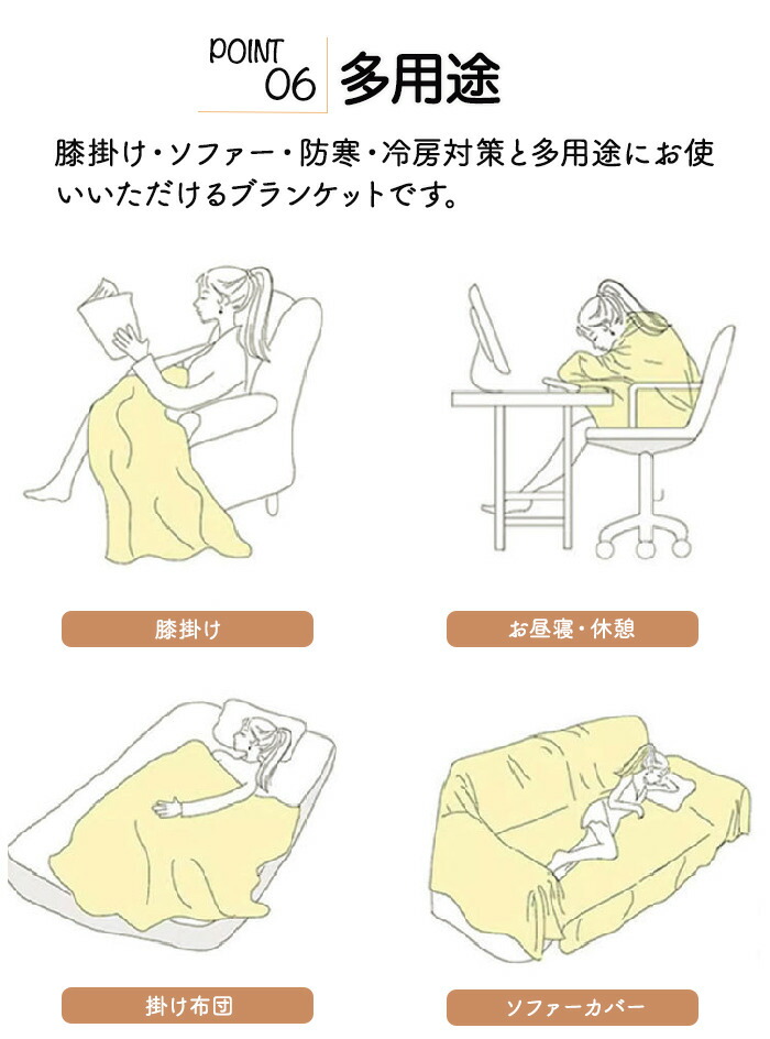 優れた吸湿性・通気性で、夏の冷房対策やタオルケット代わりにも快適。冬はひざ掛けや毛布として、羽毛布団の上に一枚重ねるだけで保温性がアップし、暖かく過ごせます。