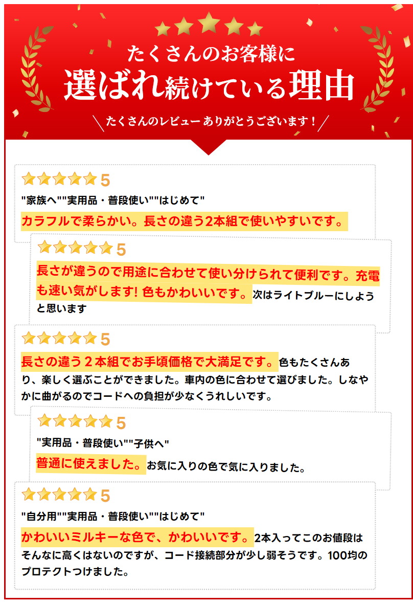 ※ケーブルはデータ転送に対応していますが、パソコンに充電することはできません。充電に使用する際には、適切な充電器を使用してください。