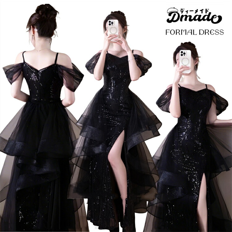イブニングドレス 黒 上品 華やか グリッター ドレス パーティードレス 韓国風 大人 ピアノ 発表会 高校生 ロング キラキラ スパンコール オフショルダー 肩出し ス キャミソール