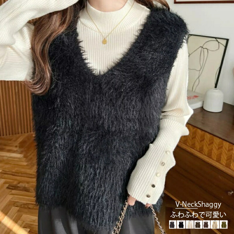シャギー ベスト レディース Vネック ニット トップス ニットベスト ショート丈 シャギーニット シャギーベスト Vネックベスト プルオーバー 秋冬 無地 大きいサイズ 体型カバー おしゃれ