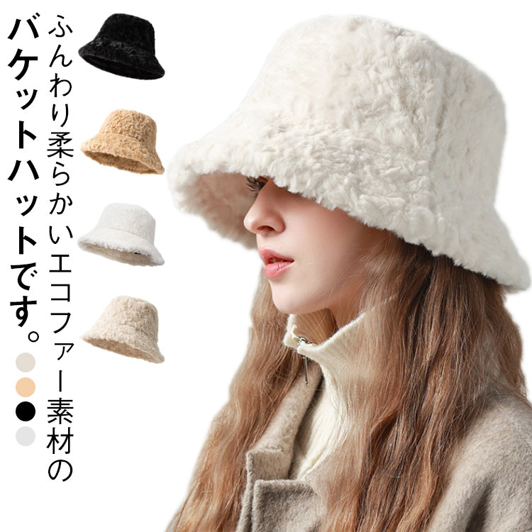 帽子 レディース フェイクファー バケットハット 秋冬 ふわふわ もこもこ おしゃれ かわいい あったか 防寒 暖かい バケハ 小顔効果 つば広 プレゼント エコファー