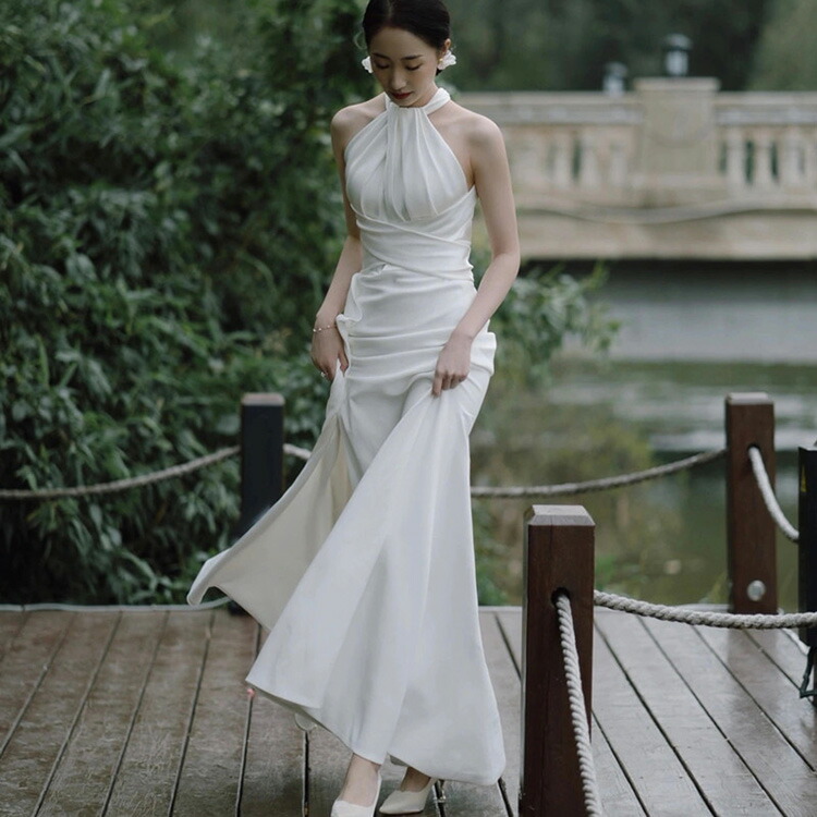 格安 白 ホワイト ウェディングドレス Aライン ホルターネック ロングドレス 花嫁 ストラップレス オフショルダー イブニングドレス 披露宴 二次会 結婚式 イベント 発表会 高級感 海外挙 演奏会