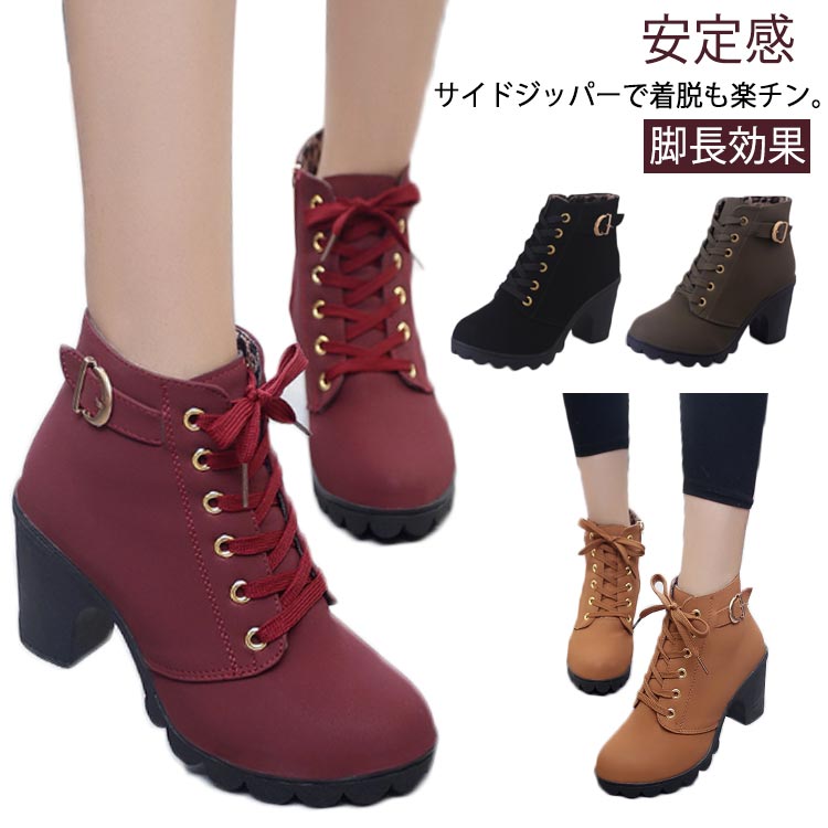 ブーティー ショートブーツ レディース ラウンドトゥ サイドジップー チャンキーヒール ハイヒール 太ヒール 安定感 レースアップ 履きやすい 歩きやすい 滑らない 美脚 脚長効果 カ アンクルブーツ