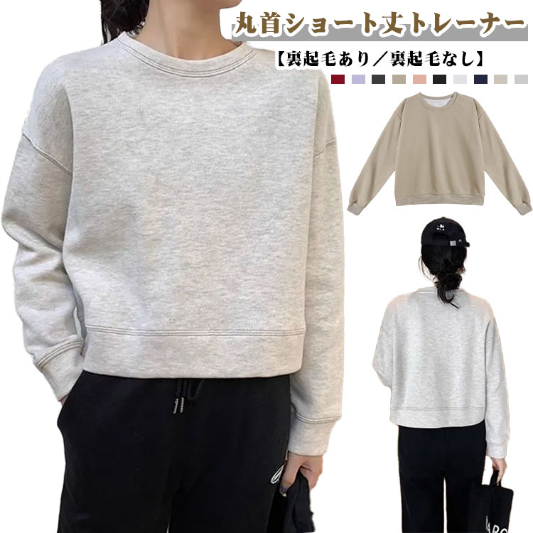 レディース トレーナー ショート プルオーバー ショート丈 裏起毛あり 裏起毛なし スウェット 丸首 綿混 ルーズ リブ クルーネック 無地 カジュア ドロップショルダー