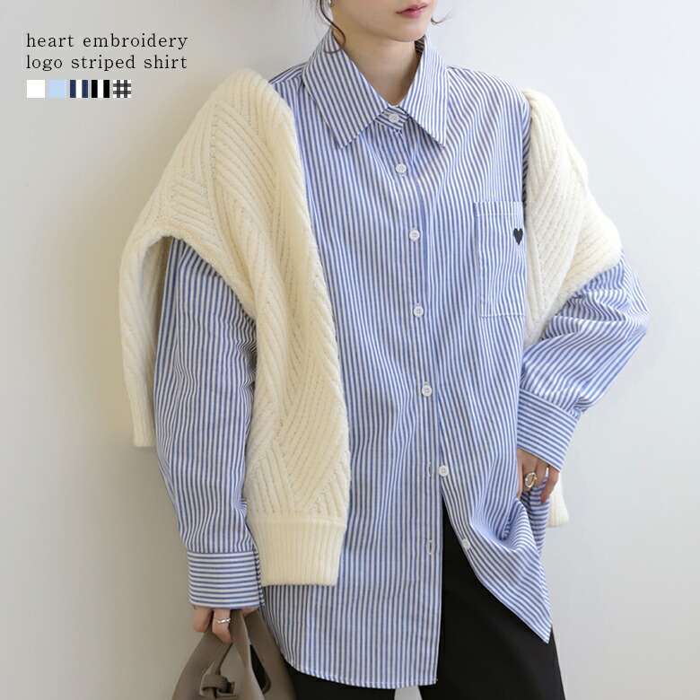 ハート刺繍ロゴ ストライプシャツ オーバーサイズ ハート柄 刺繍 ロゴ ロゴシャツ ストライプ 無地 シャツ レディース トップス