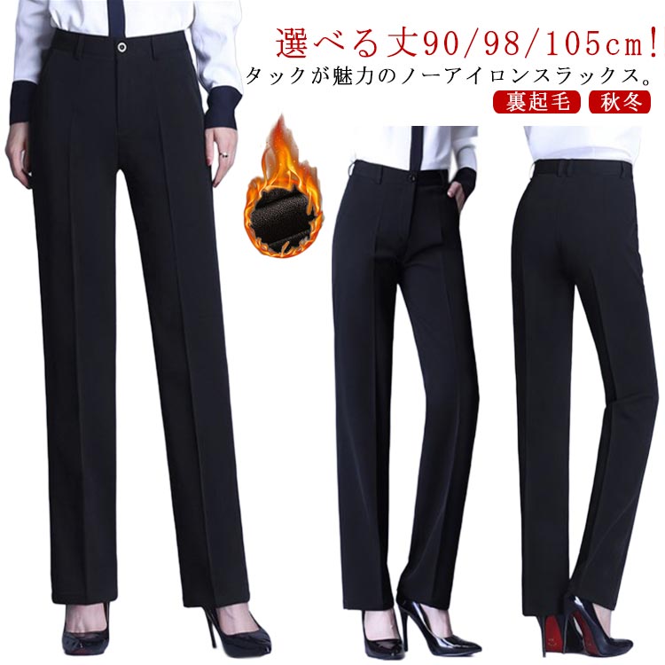 ノーアイロン スラックス 裏起毛 レディース 選べる丈 90cm 98cm 105cm ストレートパンツ スーツパンツ ワンタック ハイウェスト シンプル ロングパンツ ビジカジ 通勤 XS 暖かい