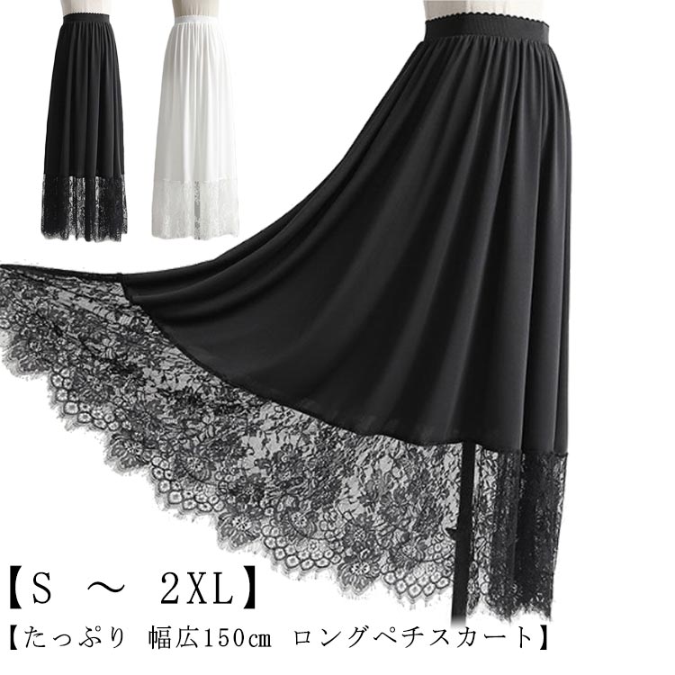 春夏 幅広150cm たっぷり ロングスカート 裾レース レース マキシ丈 スカート インナー ペチコート 黒 裾 見せ 白 大人 ガーリー ブラック 体型カバー ゆったり ホワイト