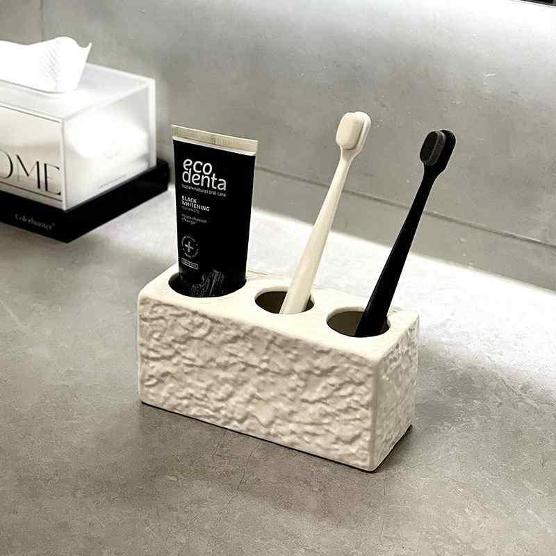 歯ブラシスタンド 歯ブラシホルダー 洗面台 浴室収納 歯磨き粉 収納ラック ブラック ホワイト 陶器製