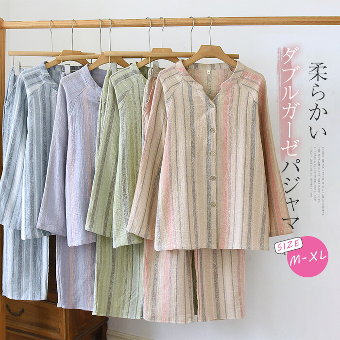 ガーゼ パジャマ レディース ダブルガーゼ ルームウェア 春 秋 冬 長袖 ストライプ 総柄 ロングパンツ ウエストゴム 部屋着 セットアップ 2点セット 寝間着 上下セット 前開き 大きいサ 寝巻き
