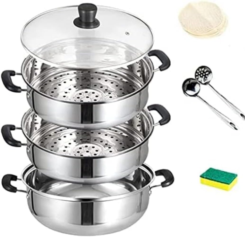 多機能 蒸し鍋 蒸し器 二段 三段 蒸しもの鍋対応熱源:対応 各種熱源対応、ガラス鍋蓋付 ステンレス シ蒸器 深型 兼用鍋 調理器具 満菜