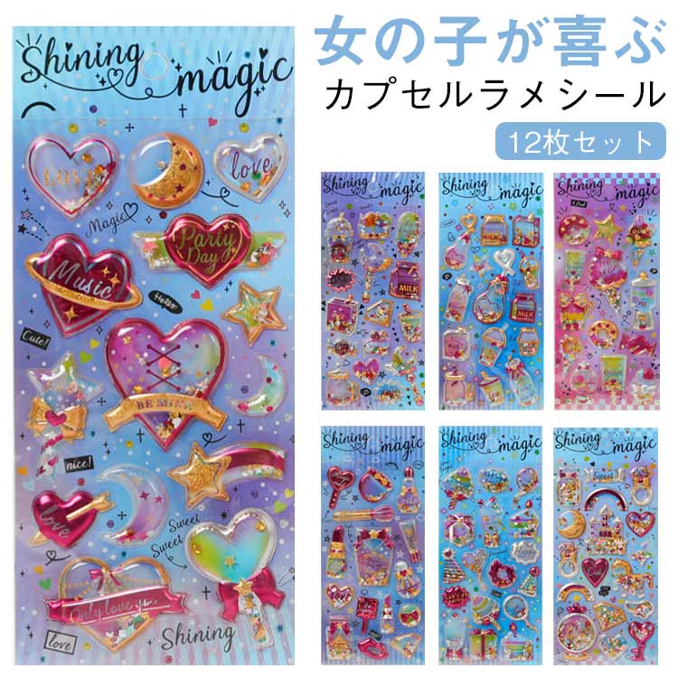 12枚セット ぷくぷく シール カプセルラメシール ぷくぷくシール 立体シール 女の子 小学生 ギャル コギャル シール帳 カラフル 派手 原宿 キラキラ SNS 交換 デコ デコシ ノート
