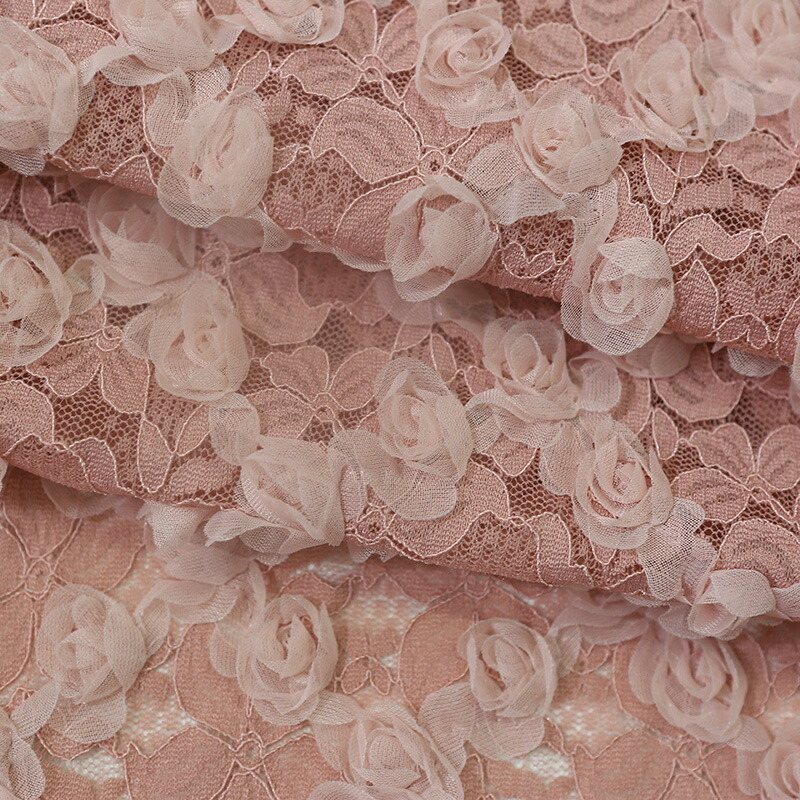 125幅のレース生地。立体バラと繊細な刺繍が施された花柄で、透明感のある薄手メッシュ素材です。ピンク、杏色、黒、白のカラー展開。