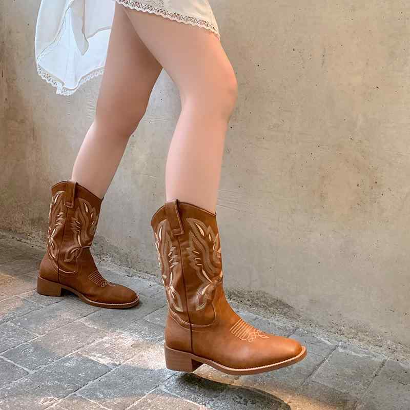 ウエスタンブーツ レディース ソフトレザー 本革 ミドル丈 ショート丈 ホワイト 刺繍 ヴィンテージ風風 普段使い 大人カジュアル シンプル スカートコーデ