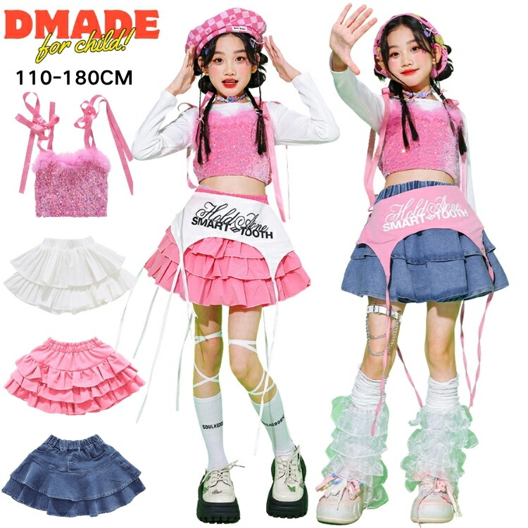 応援団 キッズ ダンス衣装 へそ出し 女の子 子供服 k-pop 衣装 ガールズ デニムスカート ダンス 演出服 スパンコール ベスト 青 白 ティアードスカート かわいい キッ ピンク