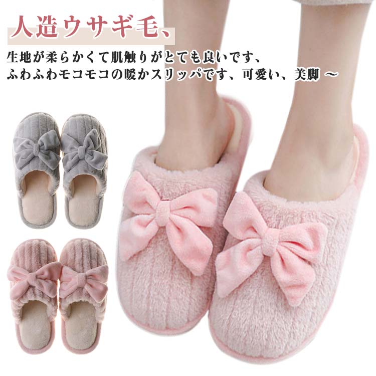 暖かい レディース スリッパ サンダル 冬 ルームシューズ 美脚 可愛い 人造ウサギ毛 おしゃれ 静音 滑り止め あったか もこもこ リボン付 防寒 室内履き 部屋用 オールシー 靴