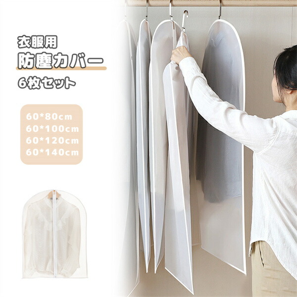 服防塵カバー 服カバー 6枚セット 洗える 衣類カバー 簡単服収納 ダストカバー 素材 半透明クローゼット整理 前開きファスナー