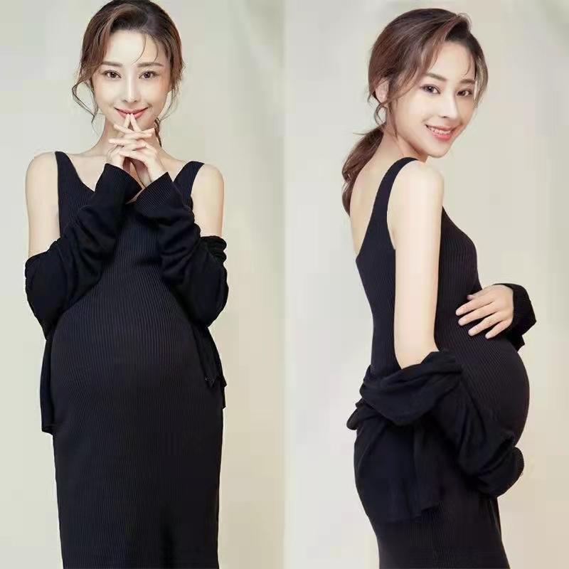 妊婦 フォト 衣装 マタニティ おしゃれ ファッション 写真 撮影 スタジオ 魅惑的 スリム 黒 セーター ニット ブラック ワンピース スカート フリーサイズ