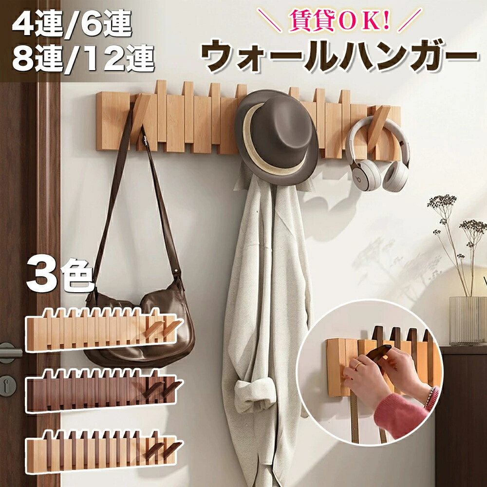 ウォールハンガー 石膏ボード 壁掛けフック ウォールフック コートハンガー カバン掛け 壁 賃貸 壁掛け 木製4連 6連 8連 12連 玄関 北欧 スリム キッズ 壁付け コンパクト 収納 木 頑丈