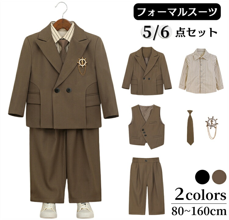 キッズ フォーマル 男の子 スーツ 6点セット ベスト ブローチ付 卒業式 入学式 小学生 120 130 150 160 80 90 100 110 ゆったり 卒園式 服 上下セット ネクタイ 子供