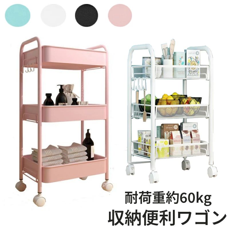 キッチンワゴン キャスター付き 3段 カート メッシュ キッチン バスケット 台所 かご スチール ラック メタル シェルフ 棚 すき間 小物 ホワイト ブラックグリーンー ピンク 収納