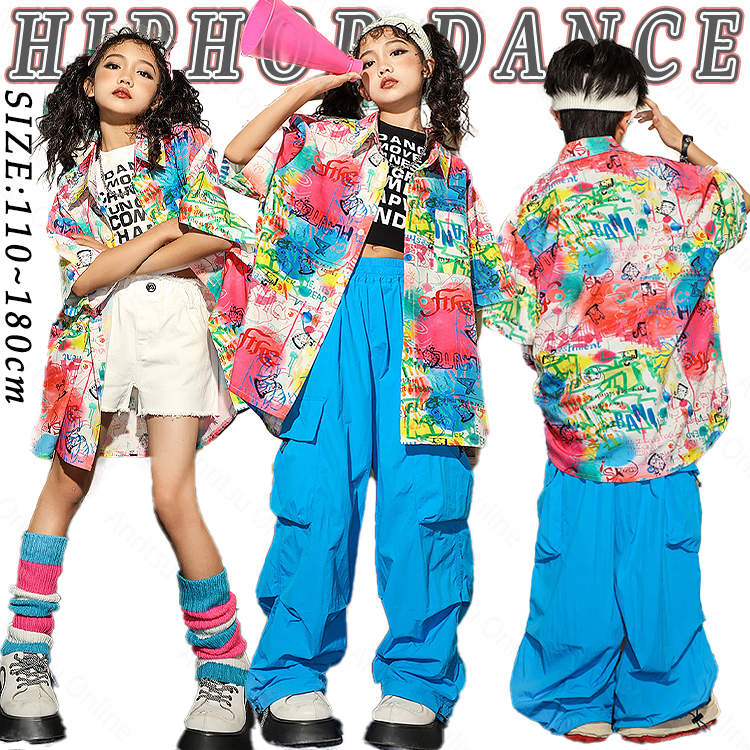 虹色 柄シャツ 総柄 女の子 チア 青色 キッズ ダンス衣装 セットアップ 半袖 シャツ 男の子 黒 タンクトップ へそ出し トップス 白 ショートパンツ ヒッフポッフ ジャズダンス 韓 ワイドパンツ