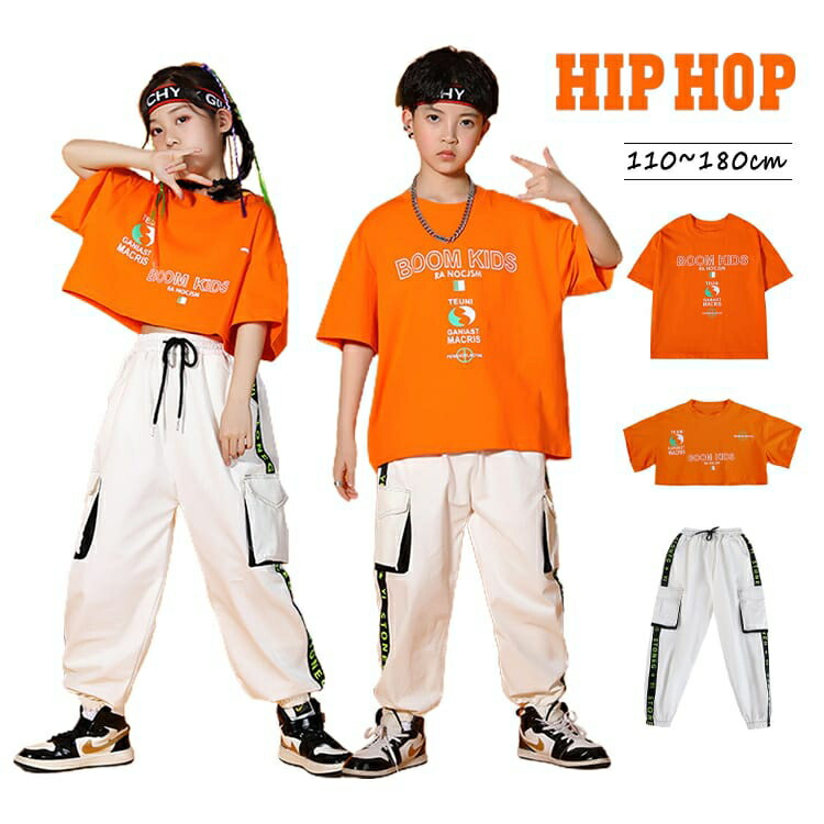 キッズダンス衣装 セットアップ 子供服 Tシャツ オレンジ ダンス服 キッズ 男の子 女の子 パンツ カーゴパンツ ロングパンツ 白 練習着 かっこいい 110-180 演出服