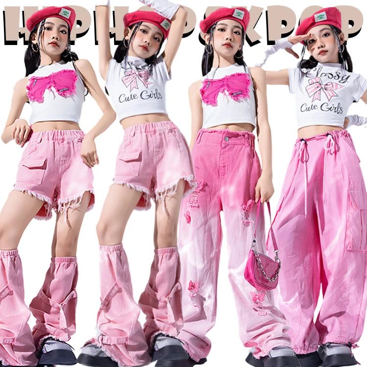 韓国 jazz 女の子 ホワイト トップス 腕カバー ピンク デニムパンツ キッズ ダンス衣装 セットアップ おしゃれ かっこいい かわいい ゆったり 半袖 ヒップホップ ジャズダンス k- へそ出し