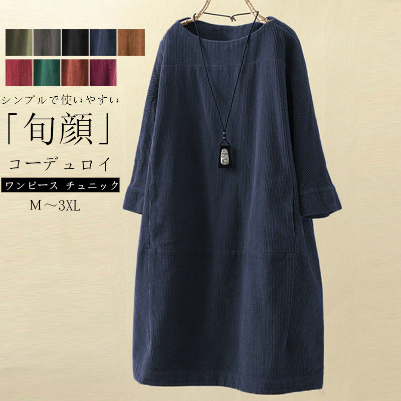ワンピース 長袖 秋冬 レディース チュニック トップス 大きいサイズ 50代 秋 冬 チュニックワンピース 大人可愛い ワンピ ミモレ丈 膝丈 コーデュロイ 薄手 クルーネック カジュアル ゆ 無地