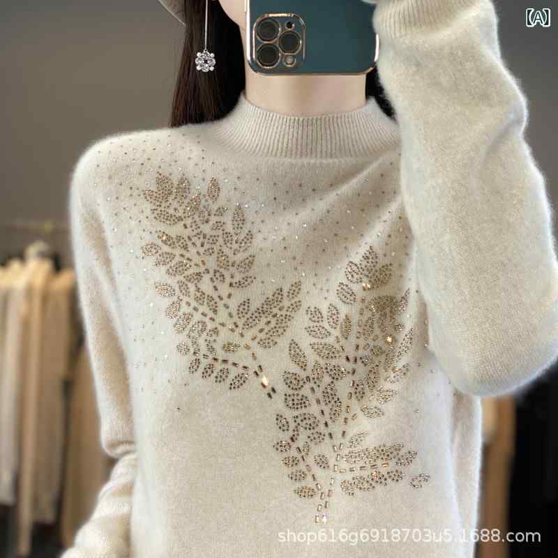 ニット レディース トップス 秋冬 半ハイネック ビジュー 飾り ポリエステル レーヨン ゆったり 長袖 プルオーバー ミドル丈 きれいめ 通勤 オフィス エレガント ベージュ ブラック オフホ 上品