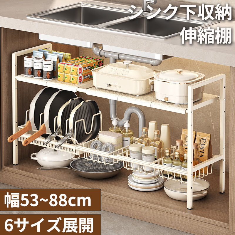 シンク下の空間を有効活用!収納力抜群の伸縮ラック。幅55~88伸縮対応、ほとんどのキッチンにフィット!