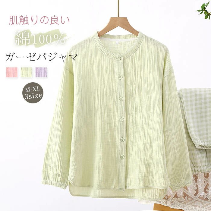 ガーゼ パジャマ レディース ダブルガーゼ ルームウェア 春 秋 長袖 チエック柄 総柄 無地 ロングパンツ 長ズボン ウエストゴム 部屋着 セットアップ 2点セット 寝巻き 上下セット 前開 寝間着