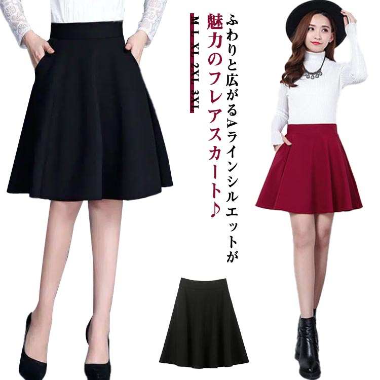 厚手 ミニスカート ひざ丈 選べる フレアスカート フレアースカート レディース ハイウエスト ポケット付き ミニ丈 美脚 フレア カジュアル インナーパンツ付 冬 サーキ ウエストゴム