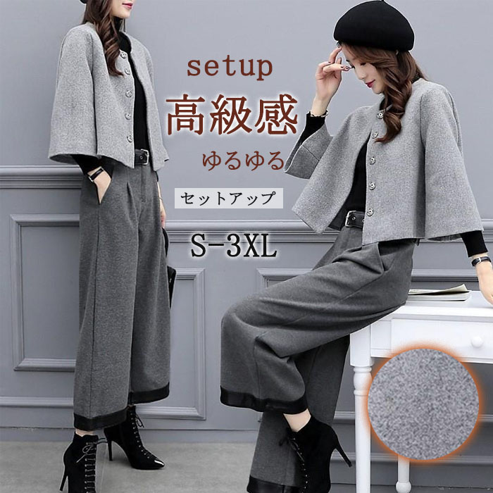 パンツスーツ セットアップ ジャケット ママスーツ ツイード パンツ ワイドパンツ ロングパンツ ハイウエスト レディース スーツ 2点セット パンツドレス 大きいサイズ 春 通勤 上下セ カジュアル