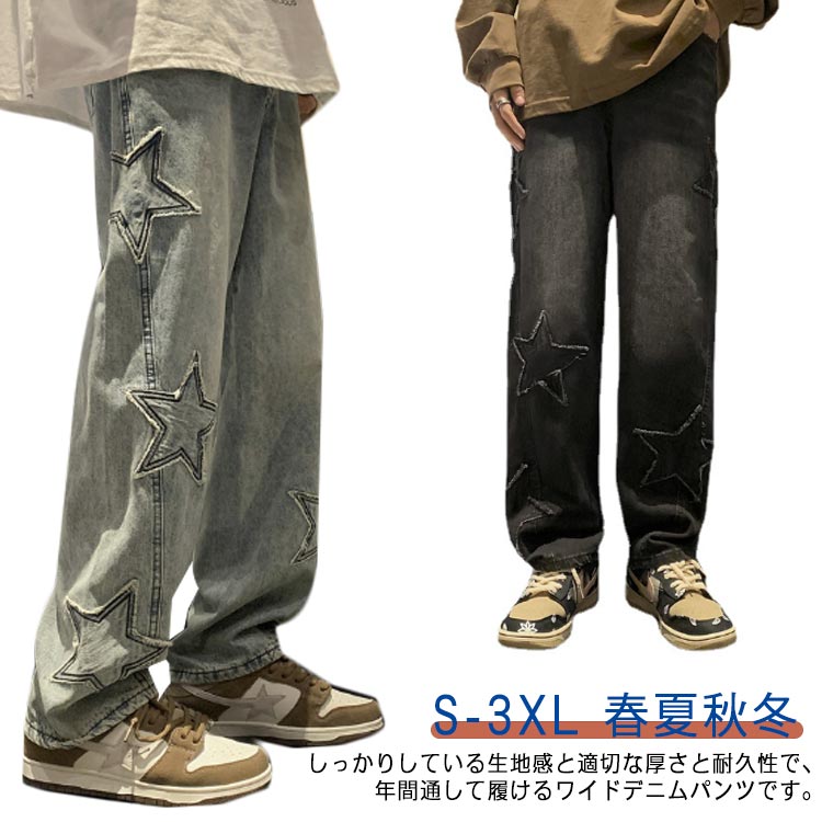 レトロ ストリート メンズ ボトムス ロングパンツ ジーンズ パンツ 長ズボン デニムパンツ 春夏秋冬 男性用 ワイド 星型 男子 ゆったり カジュアル ヒップホップ 20代 大きいサイズ